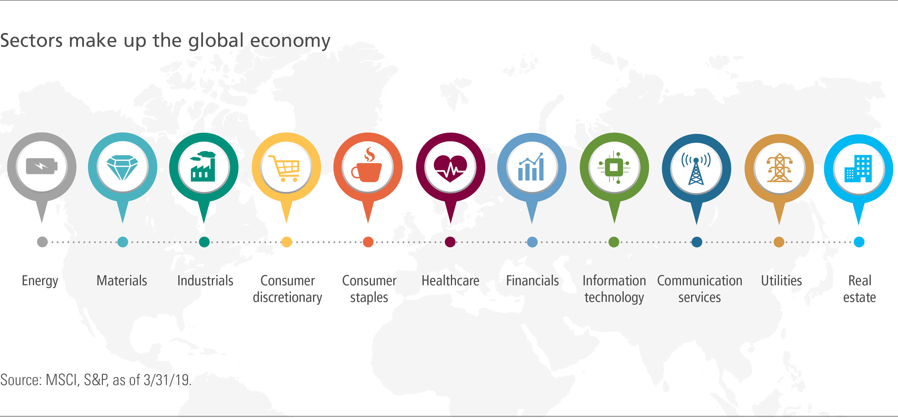 GICS는 11개의 부문(sector), 24개의 산업 그룹, 69개의 산업 및 158개의 하위 산업으로 구성됩니다. 섹터 구분은 다음과 같습니다.